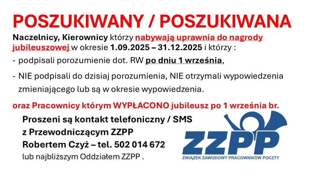 Jeżeli wg wypowiedzianego ZUZP w okresie 1.09.2025 – 31.12.2025 przysługuje Ci nagroda jubileuszowa i NIE podpisałeś porozumienia, NIE otrzymałeś wypowiedzenia / jesteś w okresie wypowiedzenia LUB podpisałeś porozumienie po 1 września br. – ZADZWOŃ.